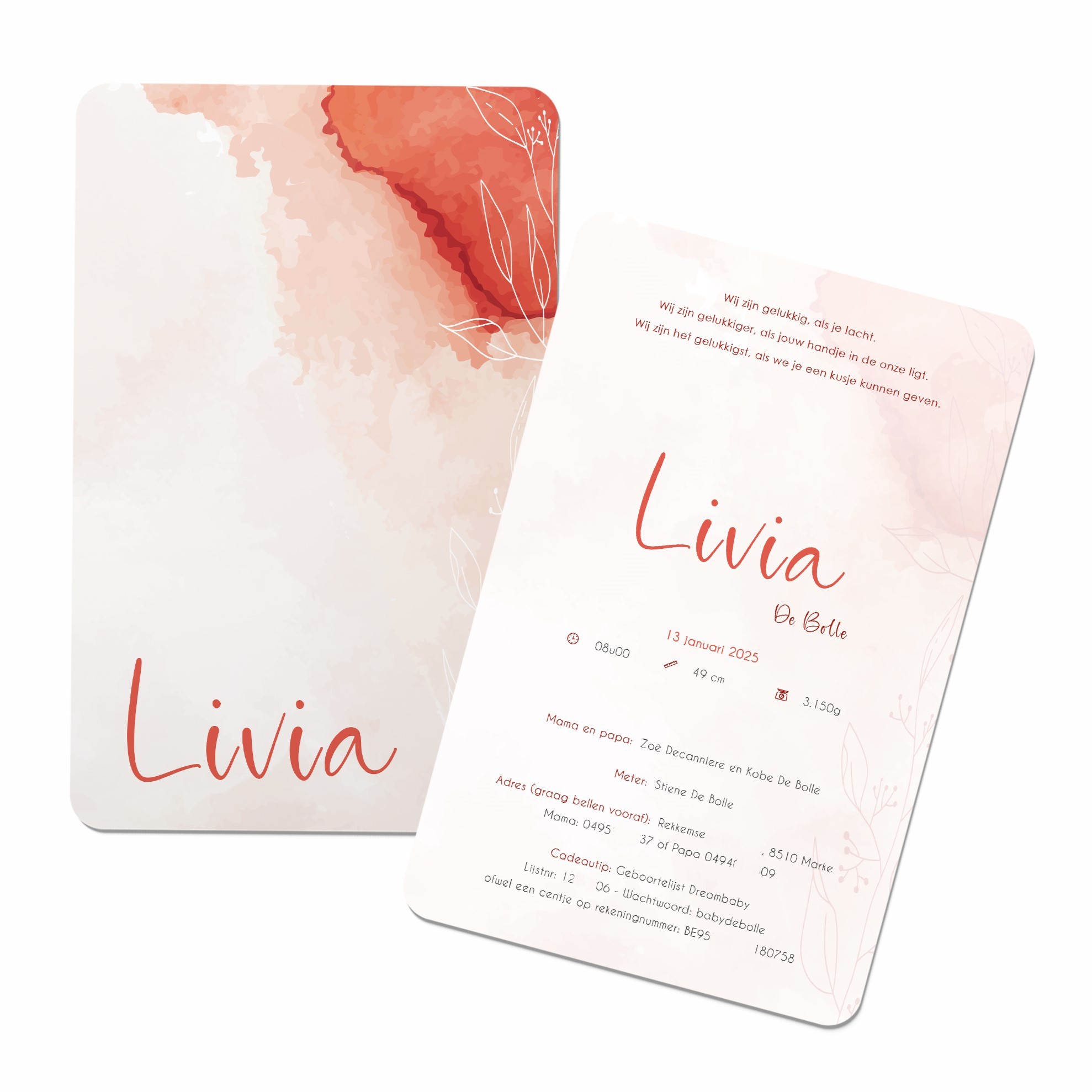 • Kleur en stijl: beige, rood, terracotta, elegant geboortekaartje voor een meisje